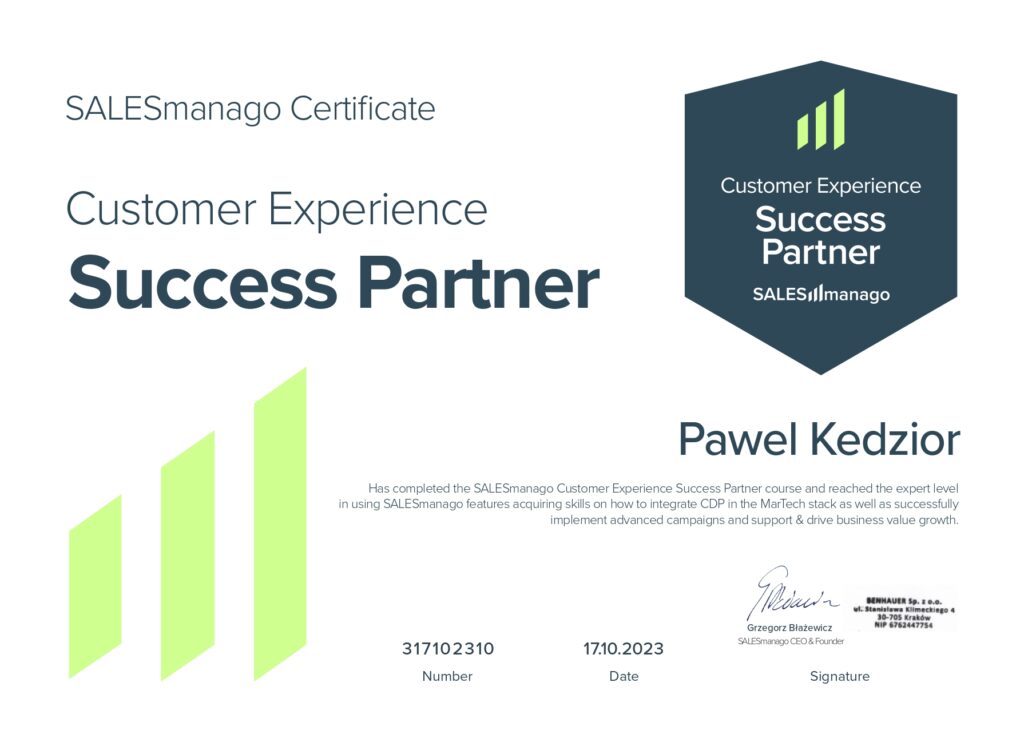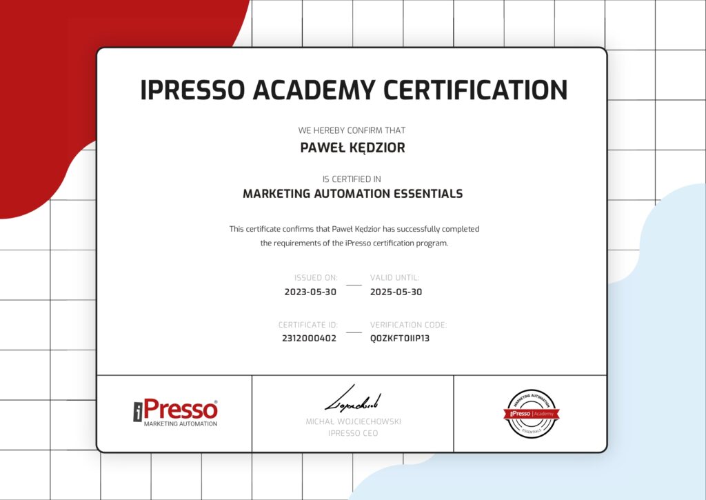Certyfikowany specjalista Marketing Automation na co dzień współpracujący z takimi narzędziami jak Salesmanago, iPresso, user.com, GetResponse, MailerLite czy Ecomail.